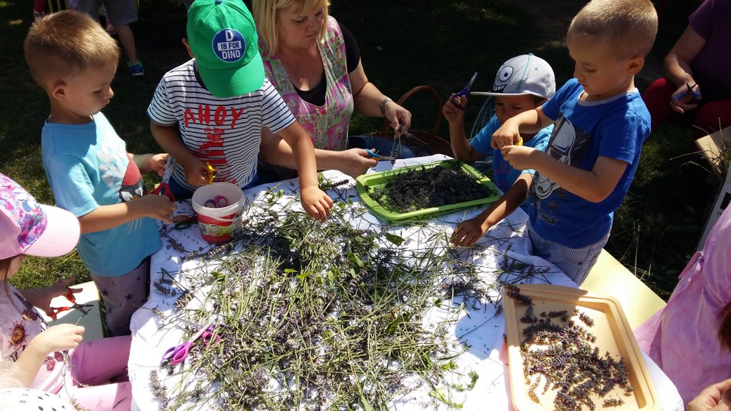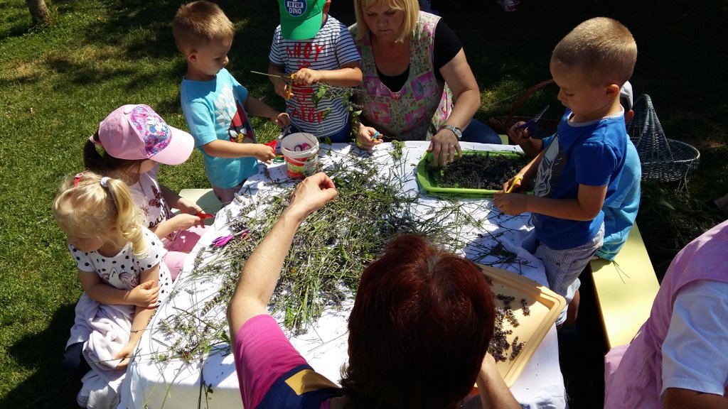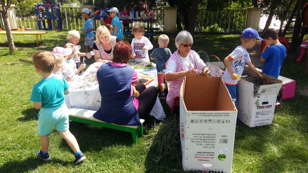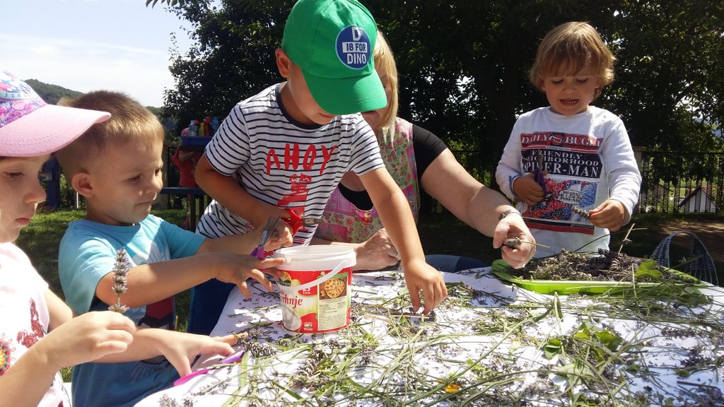 Prošlog smo tjedna, jedva ulovili dovoljno sunčan dan za berbu lavande u Tratinčici, (znamo sada da imamo lavandin, ipak nam je draže naše cvjetove nazivati lavandom). Odrasli su porezali biljke na nasadu, dok su maleni vrijedno na dvorištu rezali cvjetove za sušenje. Mirisna, umirujuća okupacija trajala je cijelo prijepodne i neki su u njoj sudjelovali od početka do samoga kraja i htjeli su još. Neka su djeca uživala u mirisu. Bilo je naravno i onih kojima je miris lavande smetao pa nisu prišli ni blizu. Ipak većina djece željela je rezuckati i sudjelovati u procesu, što nas je jako razveselilo. S našom suhom lavandom planiramo na jesen organizirati jednu zanimljivu radionicu za djecu i roditelje, ali to neka ostane malo iznenađenje. Do tada, uživajte u lakoći ljeta i ljetnim mirisima koji su obavili naš vrtić. U galeriji pogledajte dio naših aktivnosti s lavandicom.