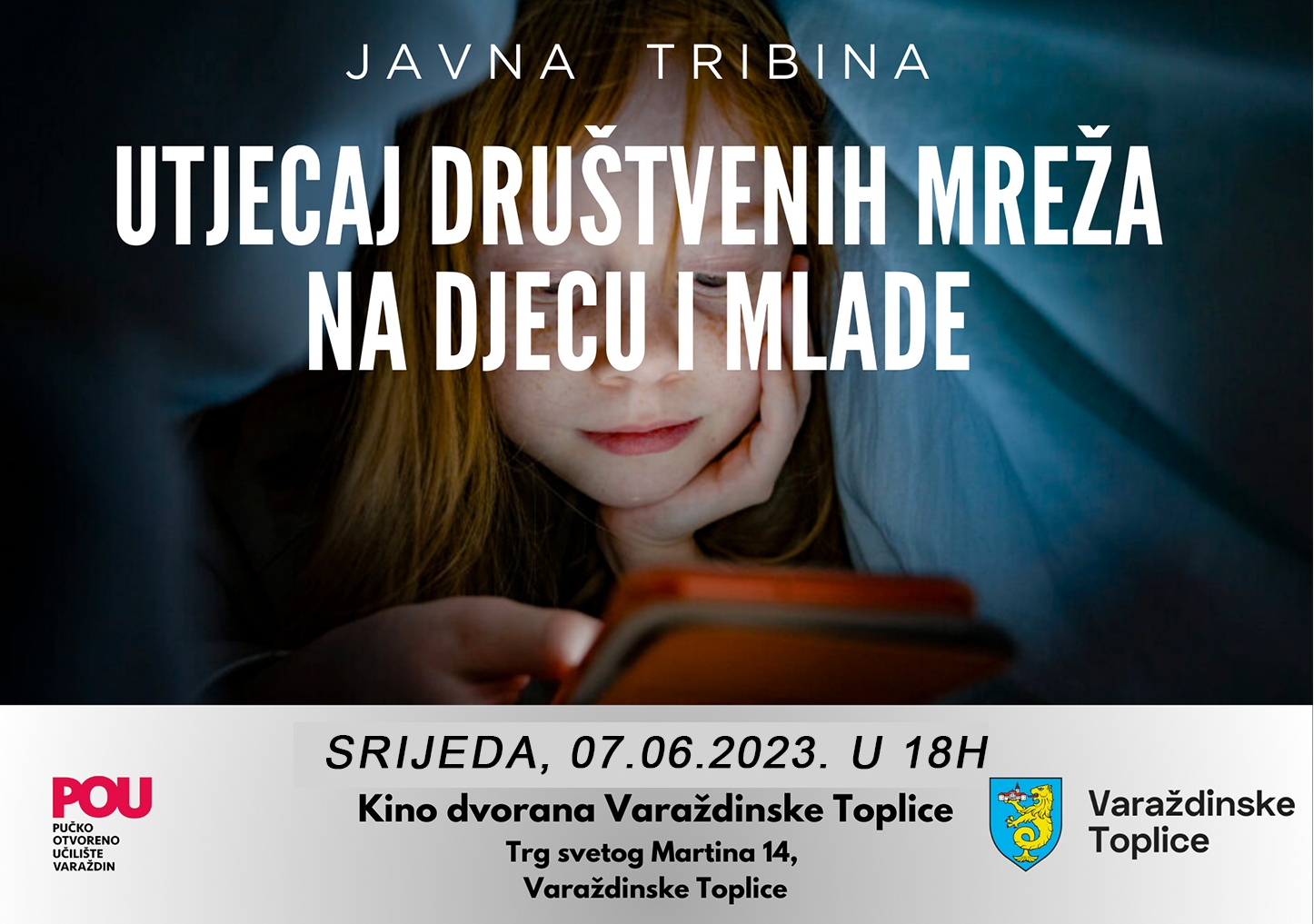 Grad Varaždinske Toplice u suradnji sa Pučkim otvorenim učilištem Varaždin organizira javnu tribinu “Utjecaj društvenih mreža na djecu i mlade” dana 07.06.2023. (srijeda) s početkom u 18,00 sati u Kino dvorani u Varaždinskim Toplicama. Javna tribina je besplatna i namijenjena općoj populaciji građana, sa fokusom na djecu i mlade, roditelje, bake i djedove, generalno naše “Društvo” danas.