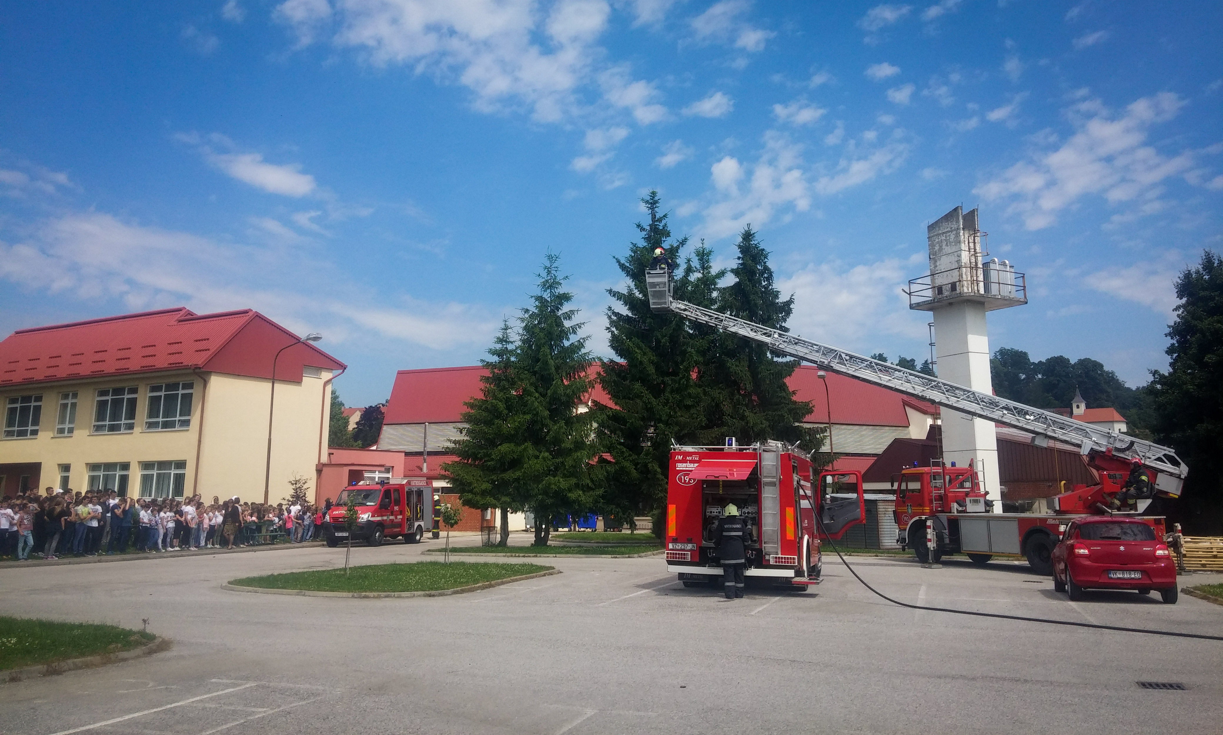 Dugotrajno zvono označilo je, 4. lipnja 2019., početak vježbe evakuacije iz topličke škole zbog “eksplozije” i izbijanja “požara” u kotlovnici. Svi su učenici s učiteljima uspješno, prema Planu evakuacije, izišli na livadu ispred škole, izvan zone opasnosti od povrede i požara, a pridružilo im se tehničko i administrativno osoblje. Dim je uočila spremačica, javila ravnateljici koja je odmah zapovjedila da se zvonom alarmiraju učenici i djelatnici škole. Novonastala situacija dojavila se Vatrogasnom operativnom centru Varaždin na broj 193. Operativni centar Varaždin poslao je dojavu operativnim članovima DVD-a Varaždinske Toplice.